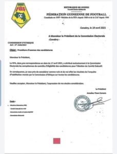 Elle s’est enfin  prononcée  malgré ou bon gré sur la candidature de Mamadou Antinio Souaré et de tous les autres candidats avant de se rétracter. Dans un courrier adressé lundi, 19 avril 2021 à la commission électorale de la fédération guinéenne de football (Feguifoot), la commission d’éthique a demandé de considérer comme nuls et de nul effet les résultats de l’enquête d’habilitation qu’elle a menés sur toutes les candidatures.