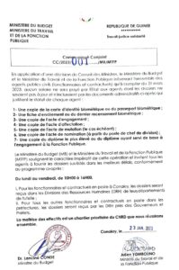 Désormais les dossiers des fonctionnaires et contractuels en poste à Conakry seront reçus dans les Directions des Ressources Humaines de leurs départements de tutelle et ceux de l’intérieur, dans les DRH près des Gouverneurs et des Préfets.