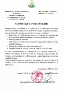 Un décret lu à la télévision nationale tard dans la soirée par le ministre secrétaire général à la présidence, Général de division Amara Camara, entouré du chef d’état-major général des armées, général Ibrahima Sory Bangoura et de plusieurs membres du Comité National de Rassemblement pour le Développement (CNRD).