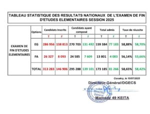Les statistiques des résultats du Certificat d’études élémentaires (CEE), qui sanctionne la fin du cycle primaire et conditionne l’entrée au collège, ont été rendues publiques ce jeudi 10 juillet 2025 par le ministère de l’Éducation nationale et de l’Alphabétisation.